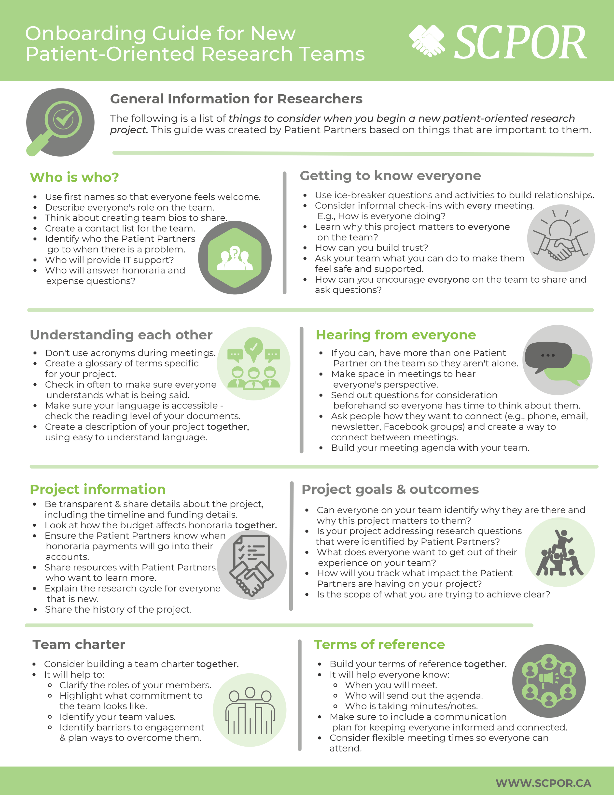 Ensure your patient-oriented research team is getting a good start with these guides, co-developed with SCPOR’s Patient Partners.